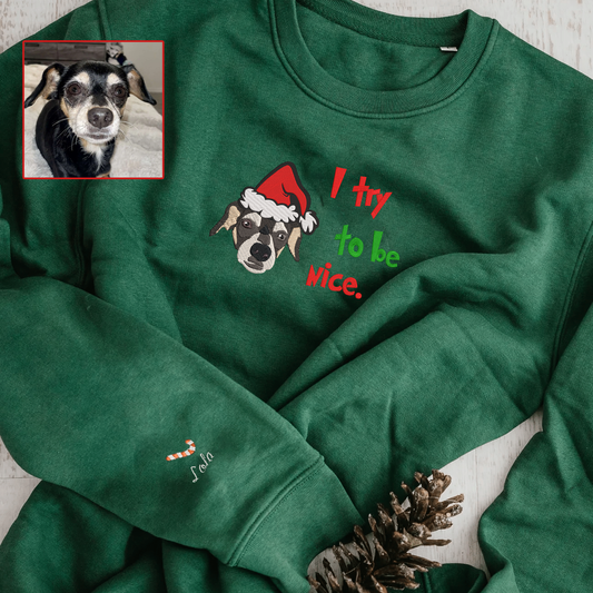 Personalized Embroidered Christmas I Try To Be Nice Pet Dog Cat Hoodie Sweatshirt T-Shirt