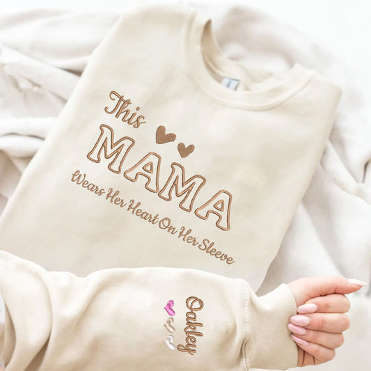 Personalized Embroidered This Mama Wears Her Hearts On The Sleeve Hoodie Sweatshirt T-Shirt